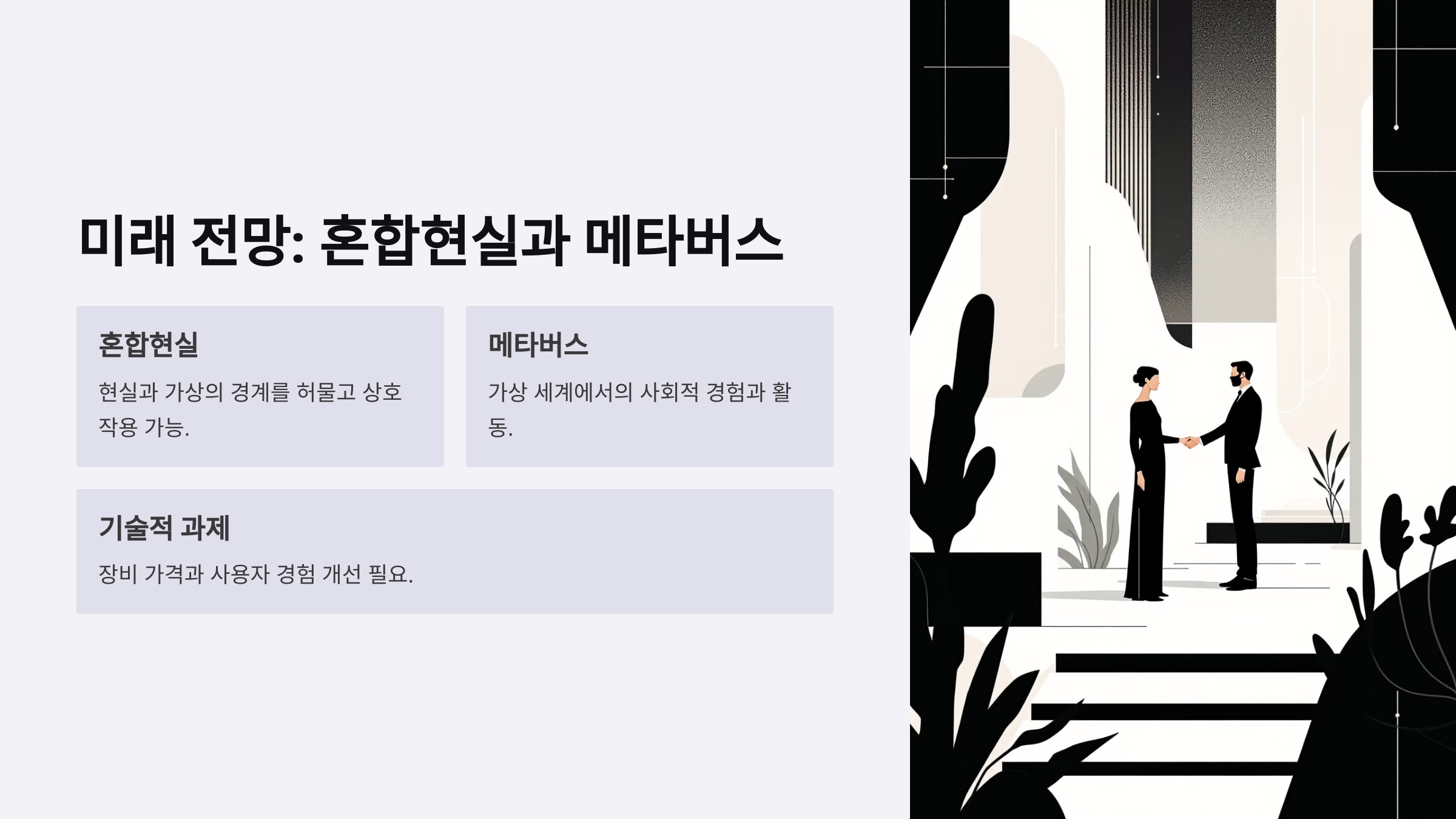 VR 기술은 점차 대중화되면서 새로운 산업적 기회를 창출하고 있으며, 미래의 혼합현실과 메타버스의 등장으로 더욱 다양한 방식으로 우리의 삶과 밀접하게 연관될 것입니다.