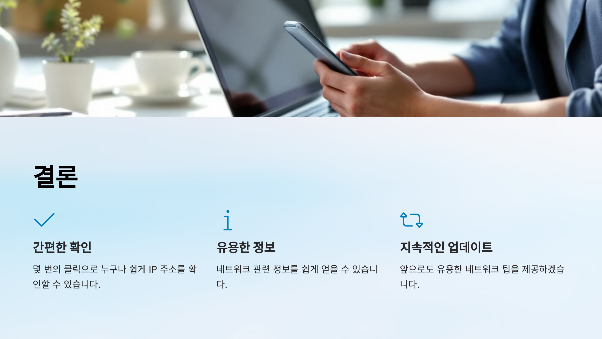 IP 주소를 찾는 방법은 기기마다 다를 수 있지만, 몇 번의 클릭만으로 누구나 쉽게 확인할 수 있습니다. 오늘 소개한 방법을 통해 내 IP 주소 확인이 필요할 때 손쉽게 정보를 얻을 수 있을 거예요! 다음에도 네트워크 관련 유용한 팁으로 찾아오겠습니다. 😄