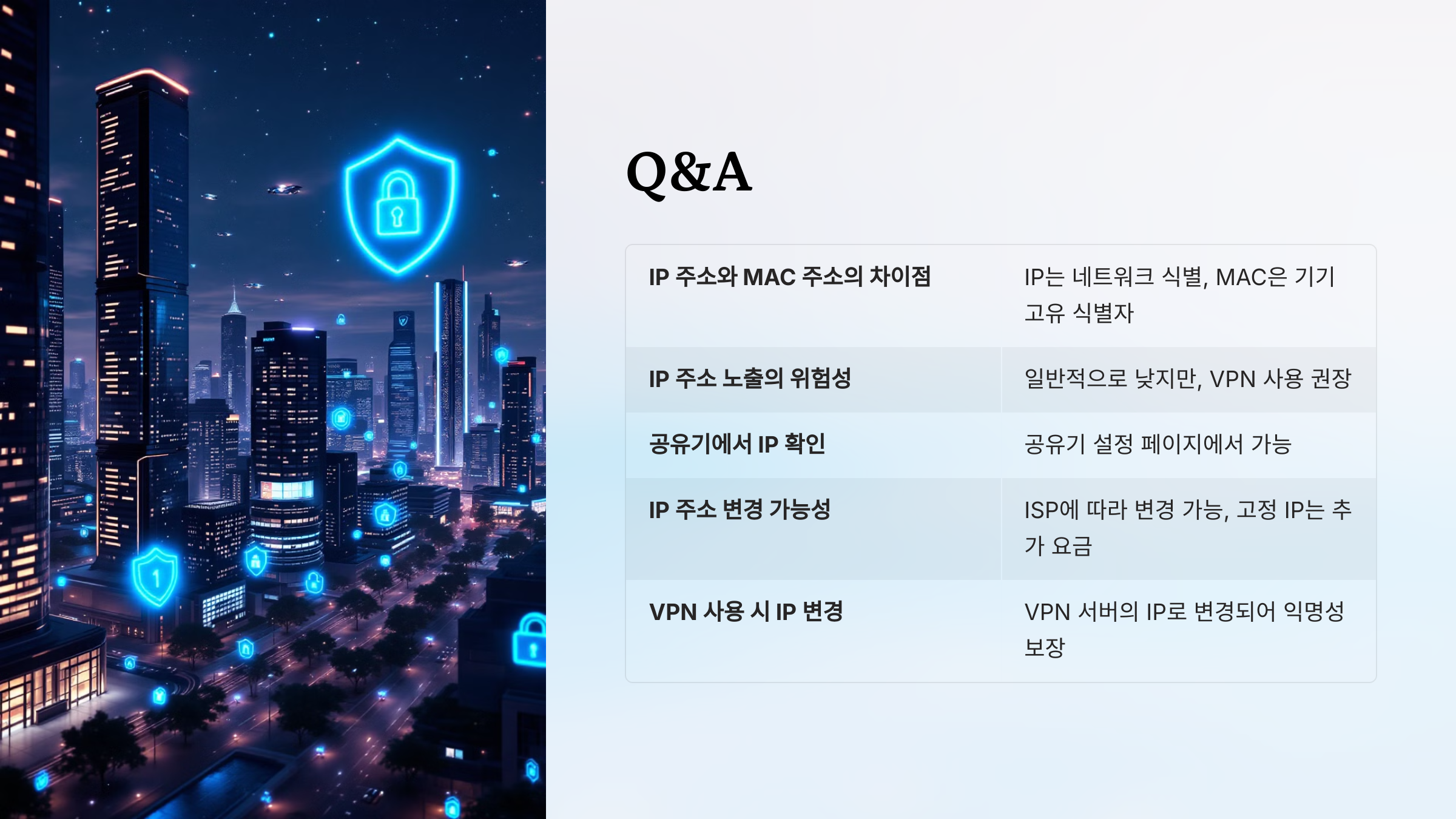 - 대부분의 경우 IP 주소 노출만으로 큰 위험이 발생하지 않지만, 보안에 민감하다면 VPN 등의 보안 솔루션을 사용하는 것이 좋습니다.