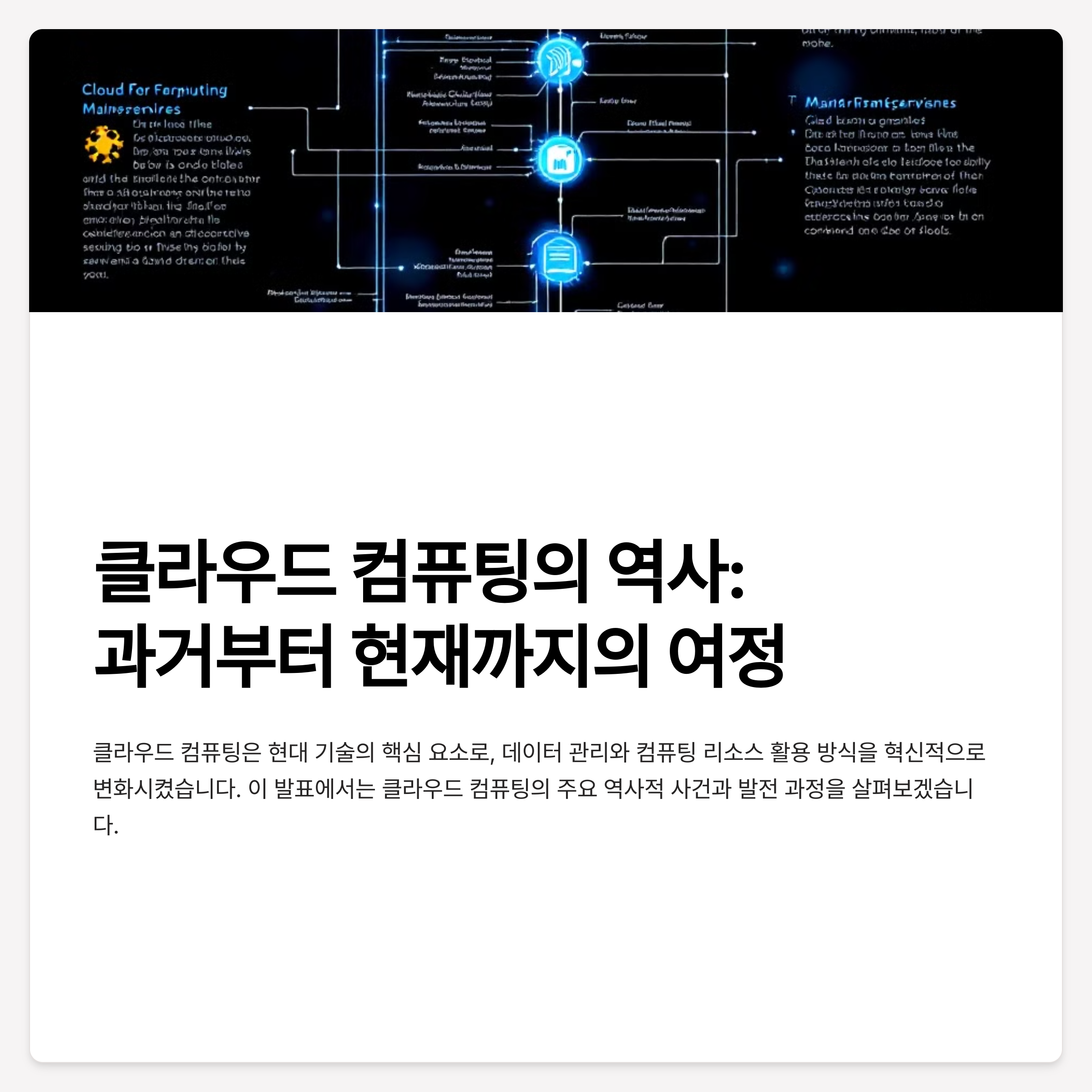 클라우드 컴퓨팅의 역사는 기술 발전과 비즈니스 환경 변화에 따라 끊임없이 진화해왔습니다. 과거의 발전을 기반으로 클라우드 컴퓨팅은 미래의 IT 생태계에서도 핵심 역할을 할 것입니다.