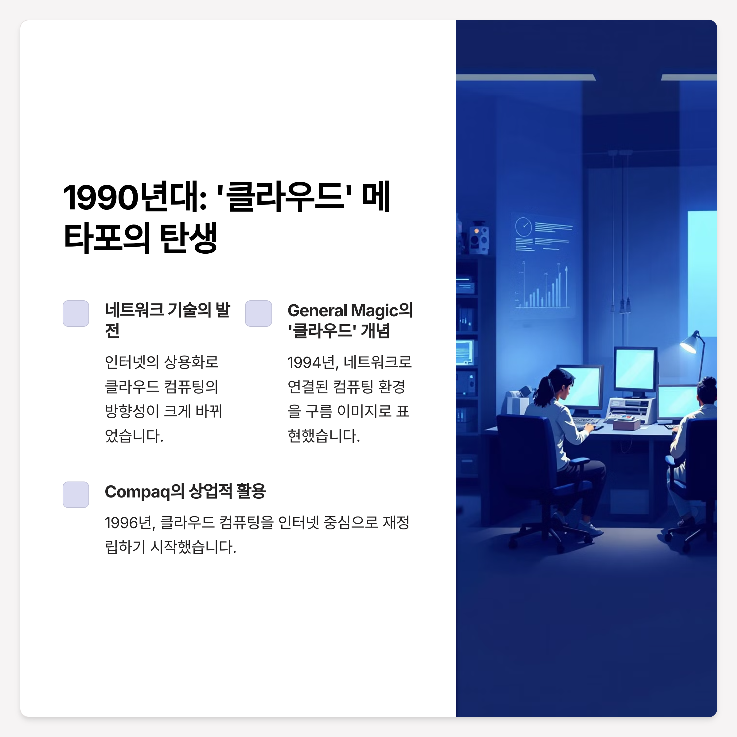 1990년대에 들어서면서 네트워크 기술의 발전과 인터넷의 상용화가 클라우드 컴퓨팅의 방향성을 크게 바꾸어 놓았습니다.
