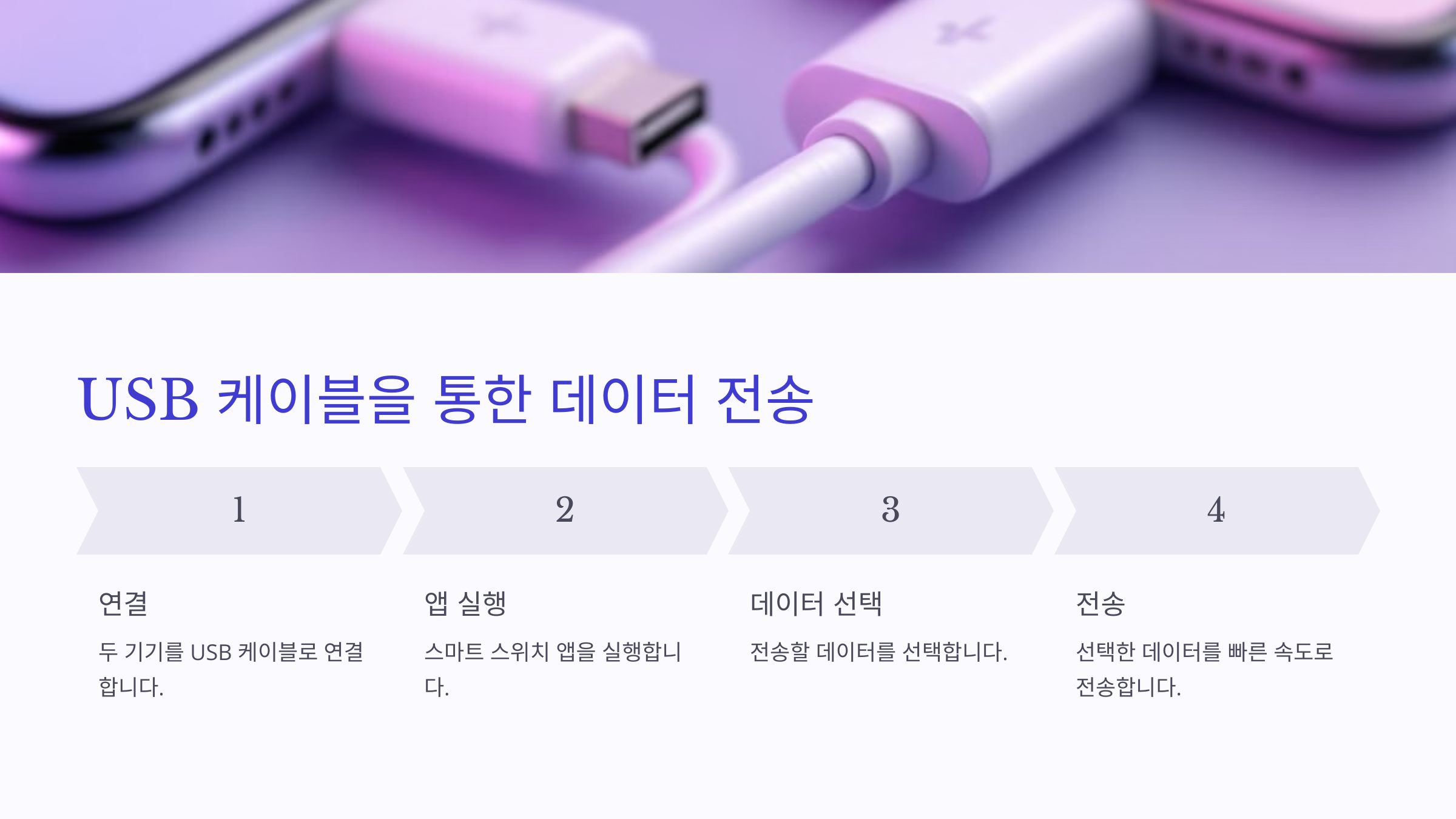 기기 간의 USB 케이블을 사용해 더 빠른 속도로 데이터를 전송할 수 있습니다. USB 케이블로 두 기기를 연결하고 스마트 스위치 앱을 통해 필요한 데이터를 선택한 후 전송을 시작합니다.