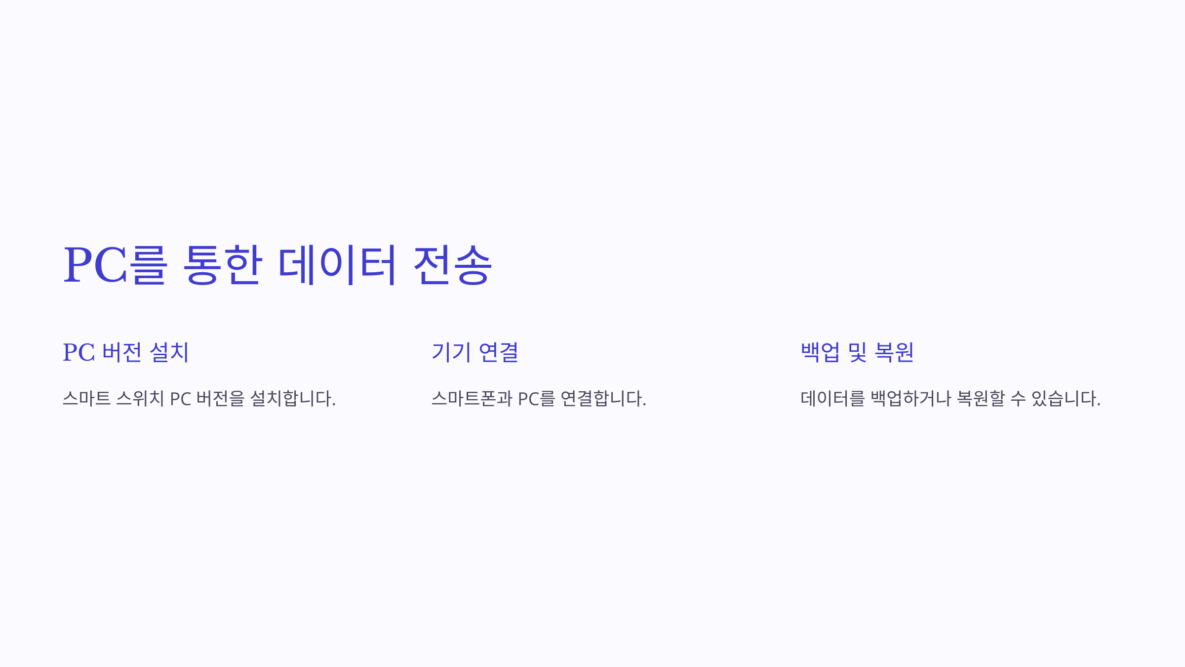 PC를 통해 데이터를 백업하거나 전송하려면 스마트 스위치 PC 버전을 설치해야 합니다. 설치 후, 기존 스마트폰과 PC를 연결해 데이터를 백업하거나 복원할 수 있습니다.