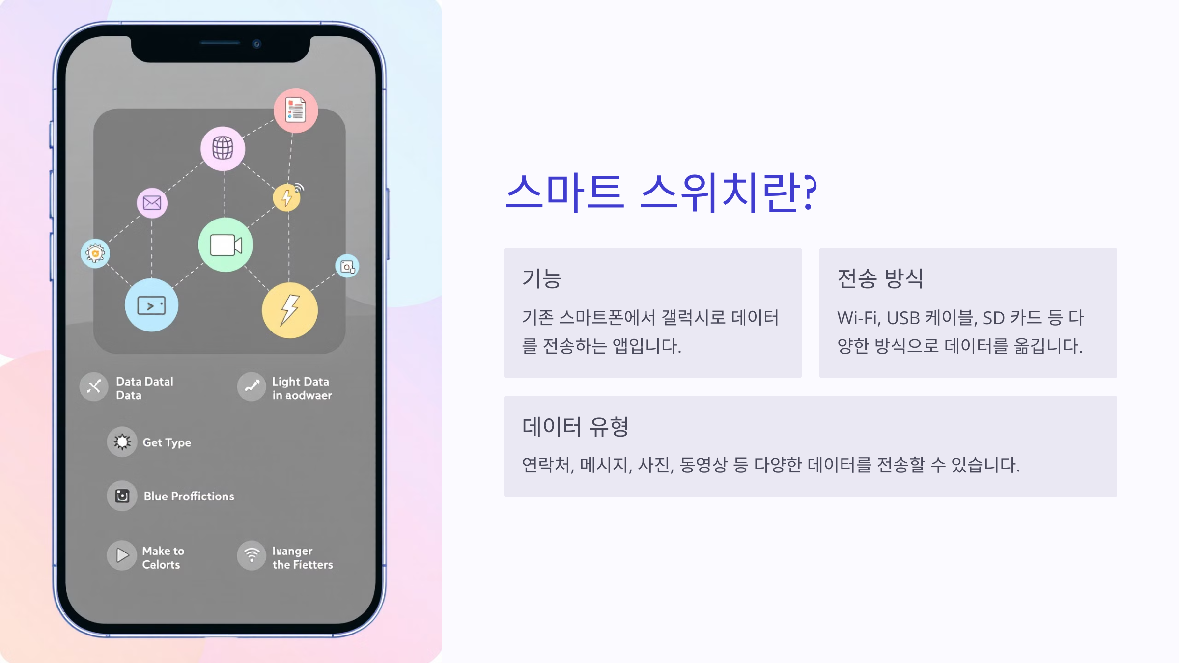 스마트 스위치는 기존 스마트폰에서 갤럭시 스마트폰으로 연락처, 메시지, 사진, 동영상 등 다양한 데이터를 전송할 수 있도록 돕는 앱입니다. 이 앱을 사용하면 Wi-Fi, USB 케이블, SD 카드 등 다양한 방식으로 데이터를 옮길 수 있습니다.