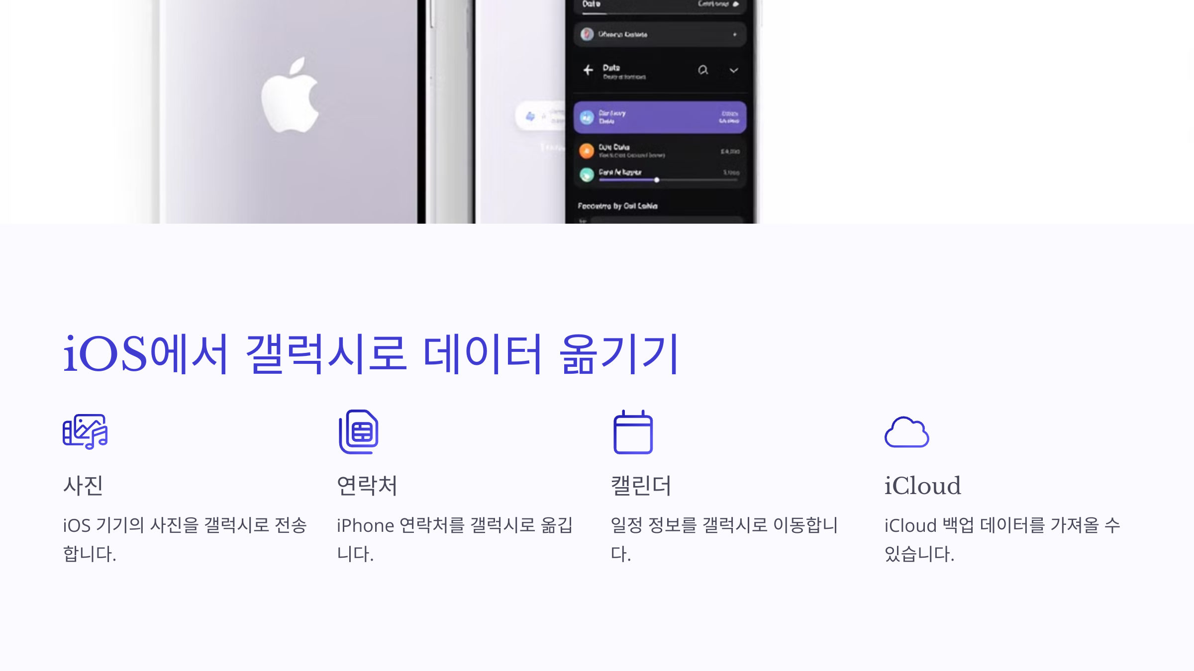 iPhone에서 갤럭시로 데이터를 옮길 경우 스마트 스위치를 사용해 사진, 연락처, 메모, 캘린더 등을 전송할 수 있으며, iCloud 백업 데이터를 가져오는 옵션도 제공합니다.
