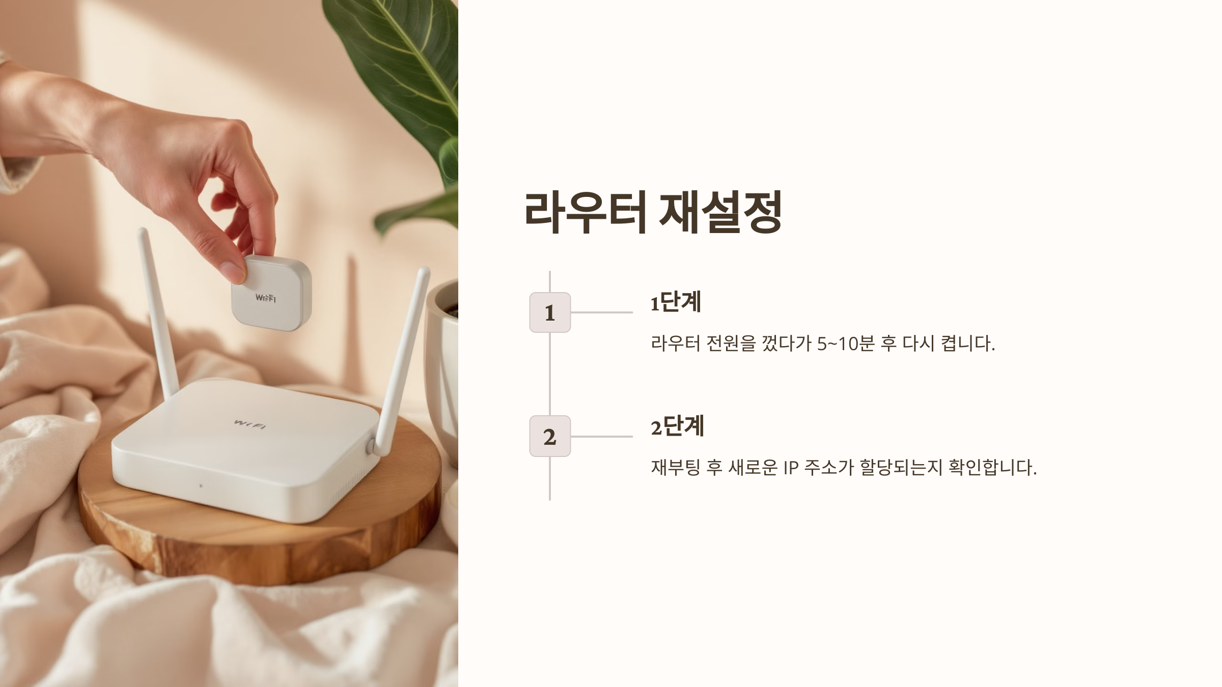 라우터를 재설정하거나 재부팅하여 새로운 IP 주소를 받을 수 있습니다. 특히 가정 내 네트워크에서 간단히 IP를 변경할 때 유용한 방법입니다.