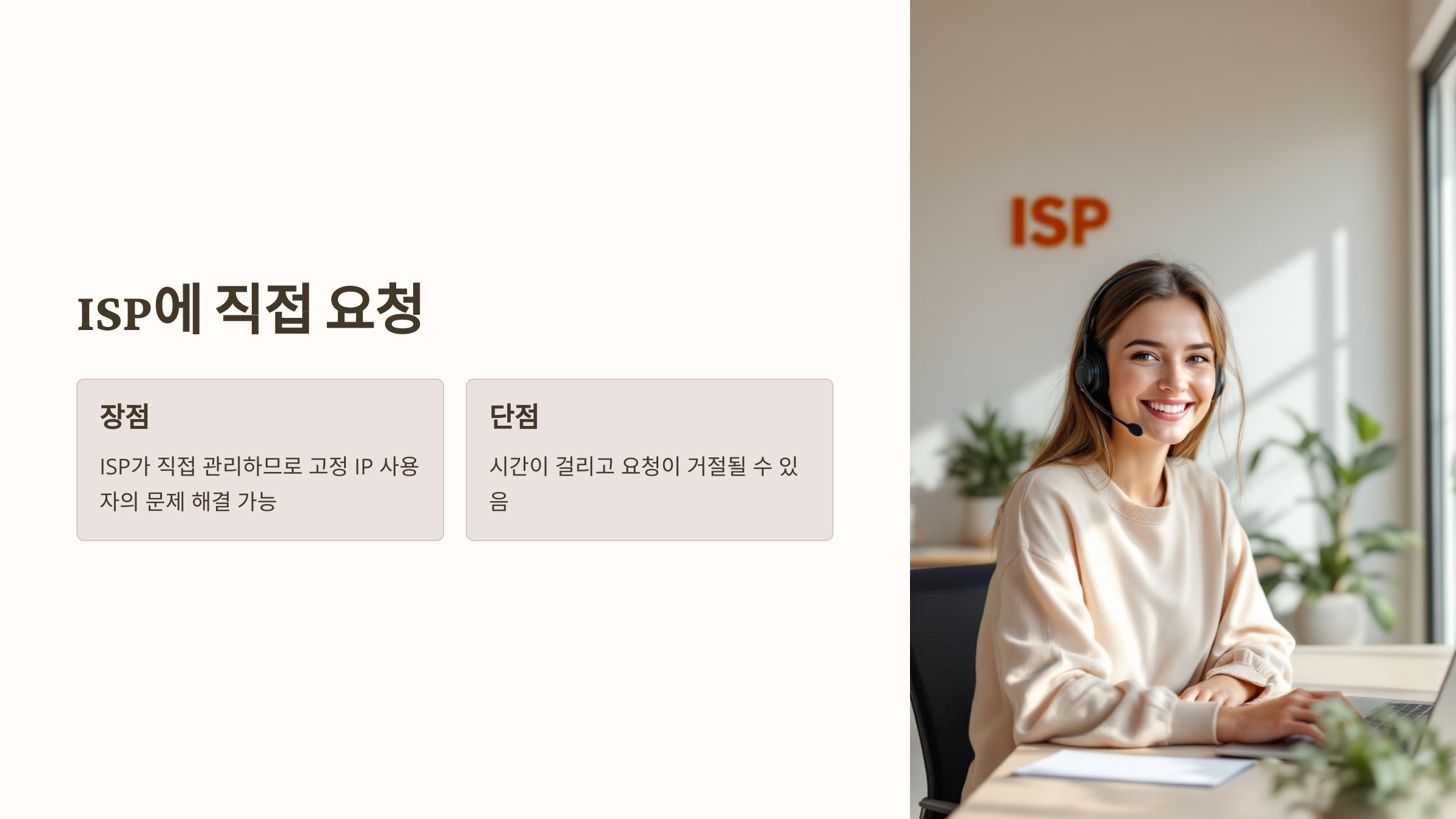 ISP(인터넷 서비스 제공자)에 연락하여 IP 주소 변경을 요청할 수 있습니다. 특히 고정 IP를 사용하는 경우 유용한 방법입니다.
