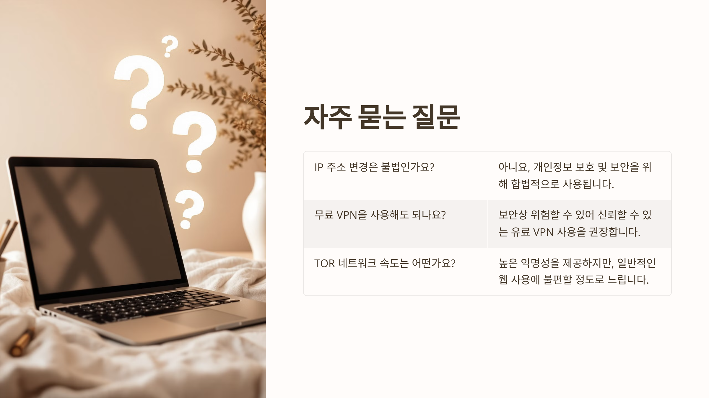 - A1: 아닙니다. IP 주소 변경은 불법이 아니며, 개인정보 보호 및 보안을 위해 많이 사용됩니다.