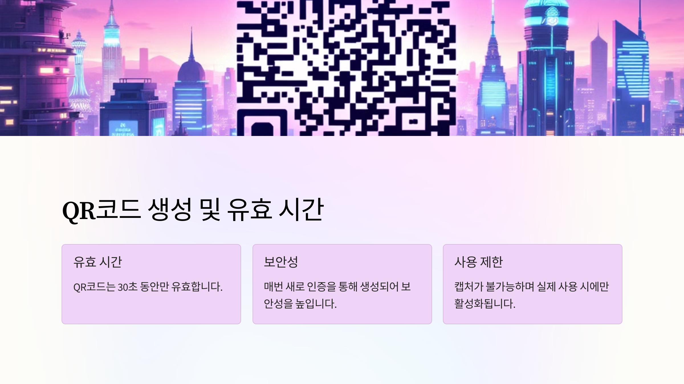 - 생체 인증을 완료하면, QR코드가 30초간 유효하게 발급됩니다.