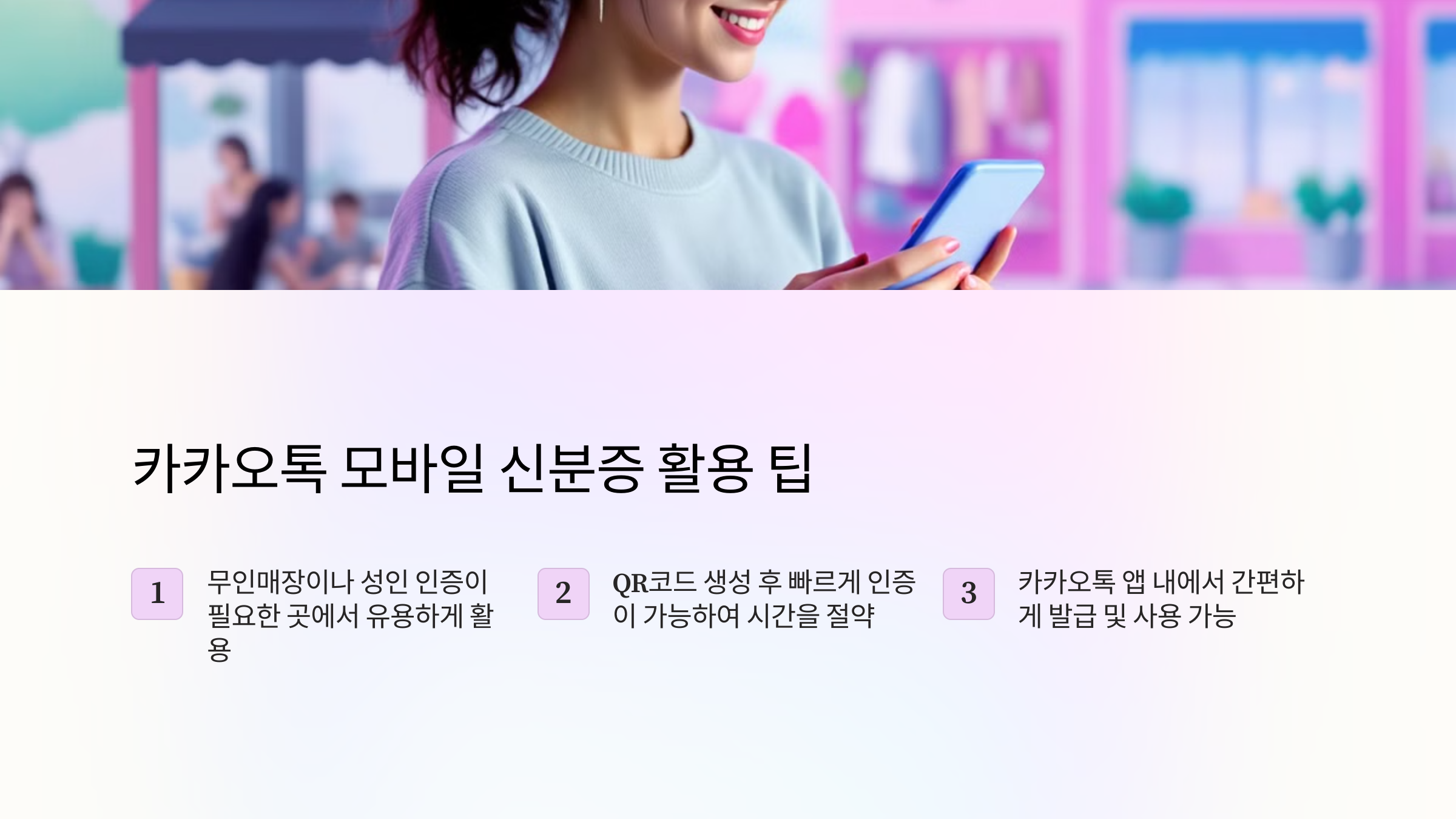 카카오톡 모바일 신분증은 지갑 메뉴에서 쉽게 접근할 수 있으며, 특히 무인매장 및 성인 인증이 필요한 서비스에 유용하게 사용할 수 있습니다. 출입 QR을 발급하여 현장에서 신속한 인증을 할 수 있으므로, 평소 주민등록증을 잊고 다니기 쉬운 분들에게 추천합니다.