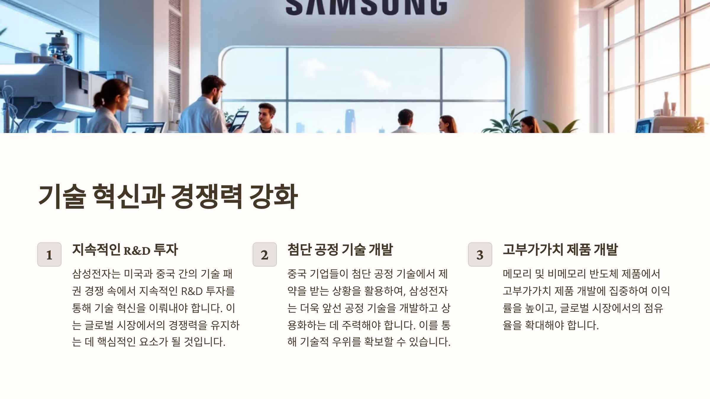삼성전자는 이러한 변화에 대응하기 위해 미국 내 투자 전략과 글로벌 공급망에 대한 재검토를 통해 리스크를 줄이고, 반도체 시장에서의 경쟁력을 지속적으로 강화해야 할 것입니다. 미국과 중국 간의 기술 패권 경쟁이 심화됨에 따라, 삼성전자는 기술 혁신과 전략적 투자를 통해 글로벌 시장에서의 선도적 위치를 지켜나가야 할 것입니다.
