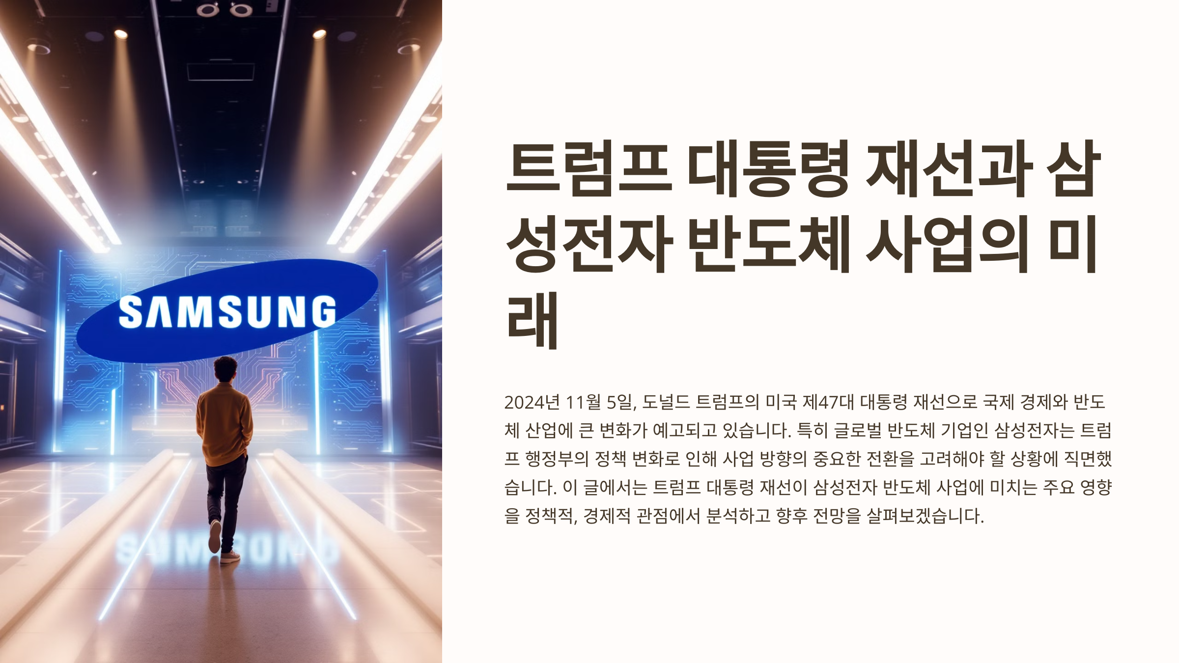 2024년 11월 5일, 도널드 트럼프 전 대통령이 미국 제47대 대통령으로 재선에 성공하면서 국제 경제와 반도체 산업에 큰 변화가 예고되고 있습니다. 특히 글로벌 반도체 기업 중 하나인 삼성전자는 트럼프 행정부의 정책 변화에 의해 그 사업의 중요한 방향 전환을 고려할 필요성이 대두되고 있습니다. 이번 글에서는 트럼프 대통령의 재선이 삼성전자 반도체 사업에 미치는 주요 영향들을 중심으로, 정책적, 경제적 관점에서의 시사점과 향후 전망을 분석합니다.