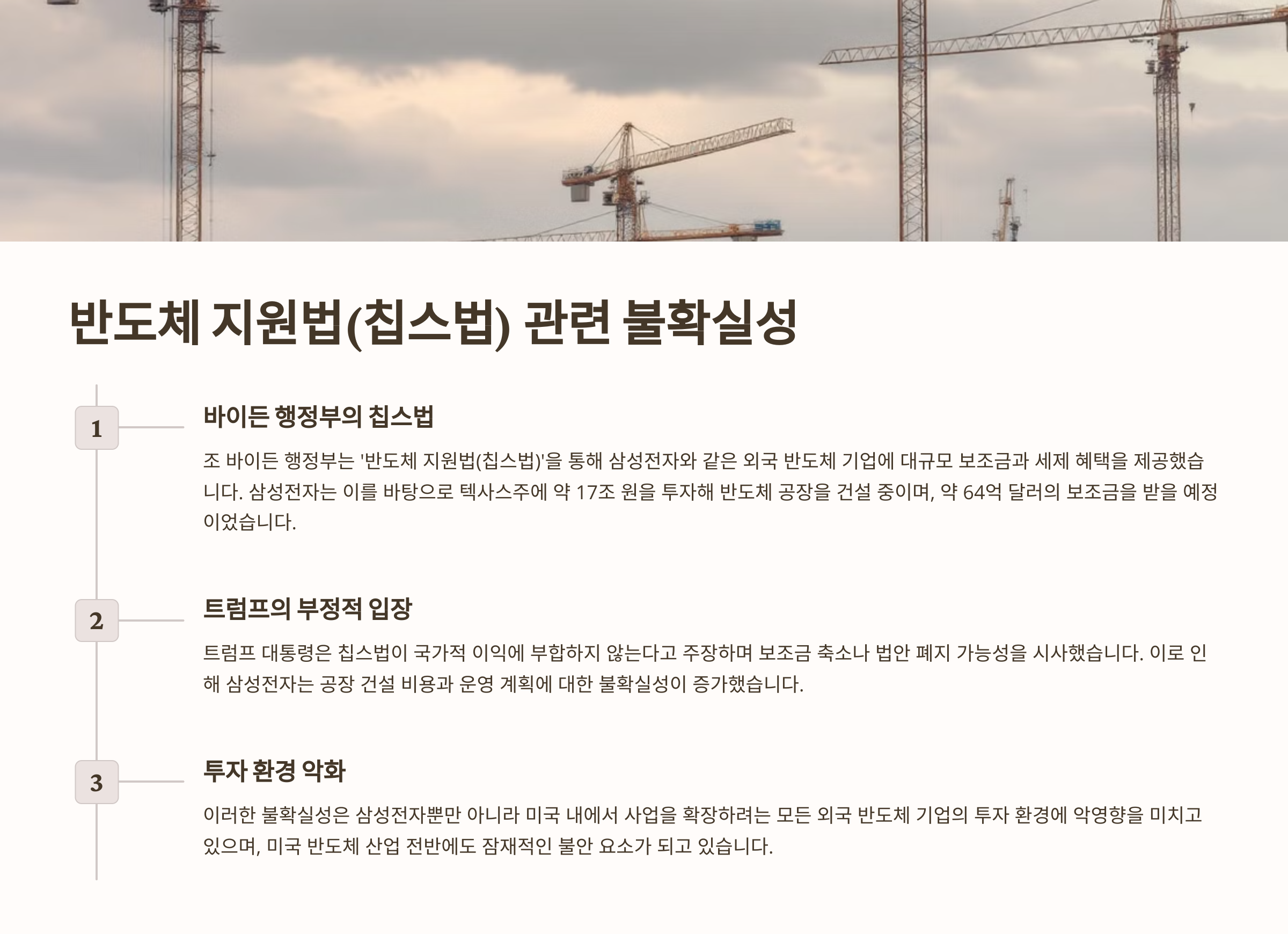 이러한 불확실성은 삼성전자뿐만 아니라 미국 내에서 사업을 확장하려는 모든 외국 반도체 기업에 대한 투자 환경에 악영향을 미치고 있으며, 이는 미국 내 반도체 산업 전반에도 잠재적인 불안 요소가 될 수 있습니다.
