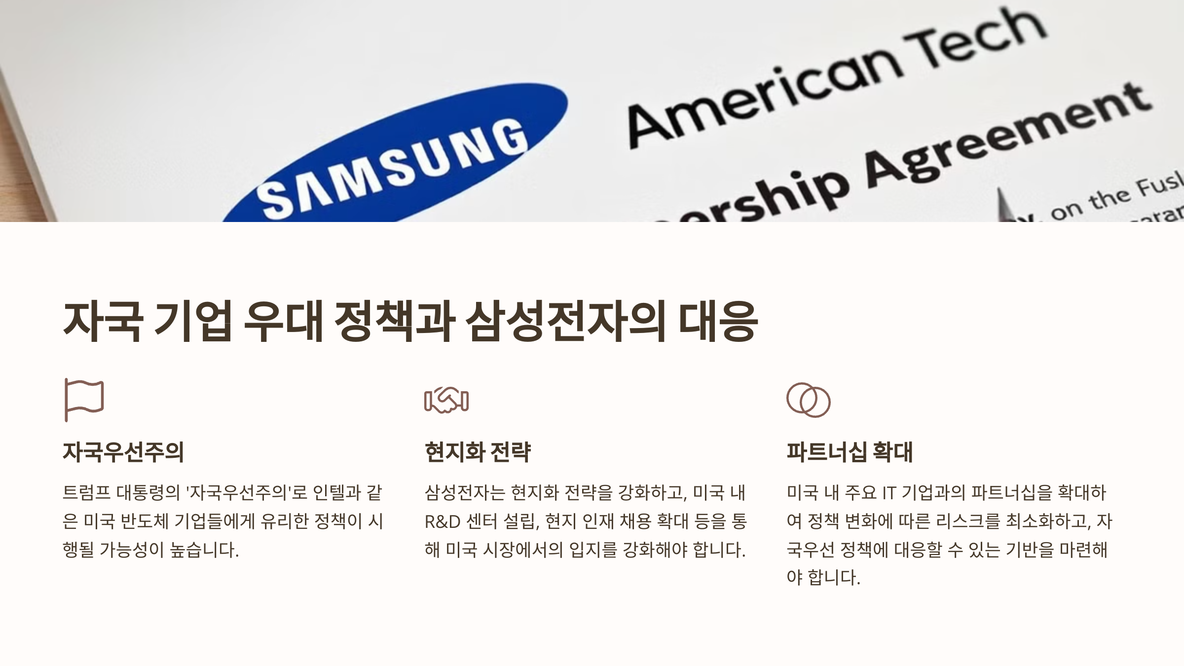 트럼프 대통령은 자국 우선주의를 내세워 외국 기업들의 미국 내 생산을 더욱 촉진하고, 자국의 경제적 이익을 최우선으로 삼으려 할 가능성이 높습니다. 삼성전자는 고관세와 보조금 삭감 가능성 속에서 미국 내 생산을 늘려야 할 압박을 받을 수 있으며, 이는 투자 비용의 증가와 더불어 생산성 향상에 큰 도전이 될 수 있습니다. 이러한 요인으로 인해 삼성전자는 미국 내 생산과 투자 전략에 대한 전반적인 재검토가 필요해 보입니다.