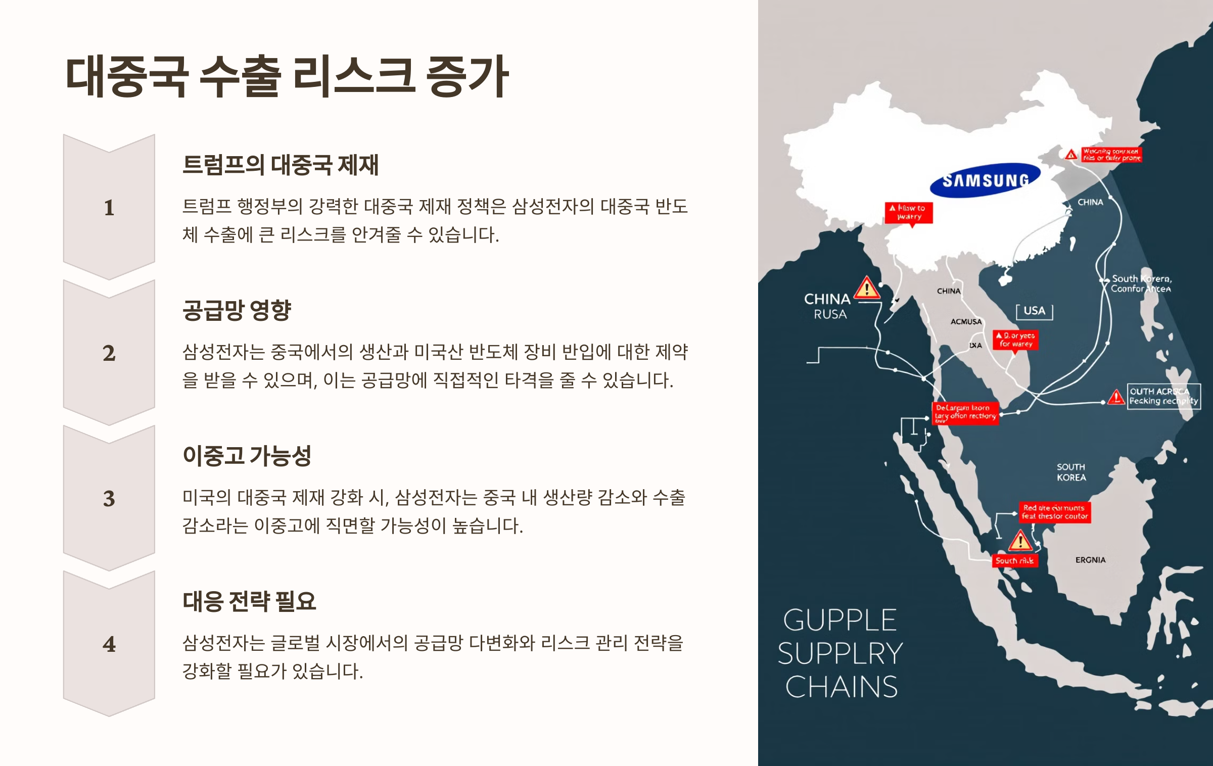 트럼프 행정부의 강력한 대중국 제재 정책은 삼성전자의 대중국 반도체 수출에 큰 리스크를 안겨줄 수 있습니다. 특히 반도체 산업은 글로벌 공급망에 크게 의존하고 있으며, 삼성전자는 중국을 주요 시장으로 삼고 있는 만큼, 미국의 제재가 강화될 경우 수출에 큰 영향을 받을 수 있습니다.